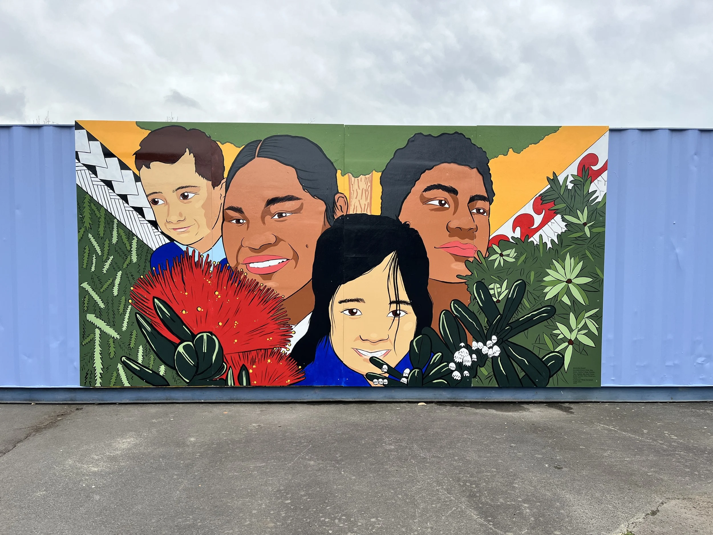 St Claudine’s school is rich with pacifica, maori, asian and pakeha students. We looked at some great art and motifs from these cultures as well as some New Zealand artists and muralists. The students created some of their own patterns and designs which are featured in the detailing on the mural. The patterns they chose were special to them and their heritage which are samoan, filipino and maori. The shapes and motifs they used represent strength, protection, resilience, family, power, guidance through difficult times, unity, union and faith.